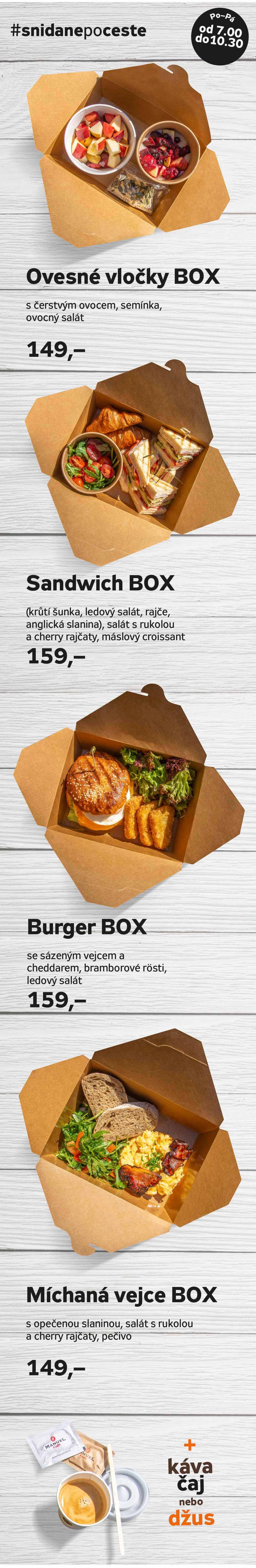| Snídaňový burger sázené vejce, slanina, cheddar, čerstvý salát, dresink, pečená cherry rajčátka | 95 Kč |